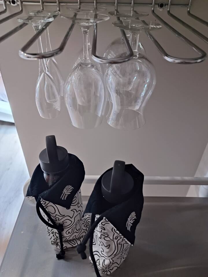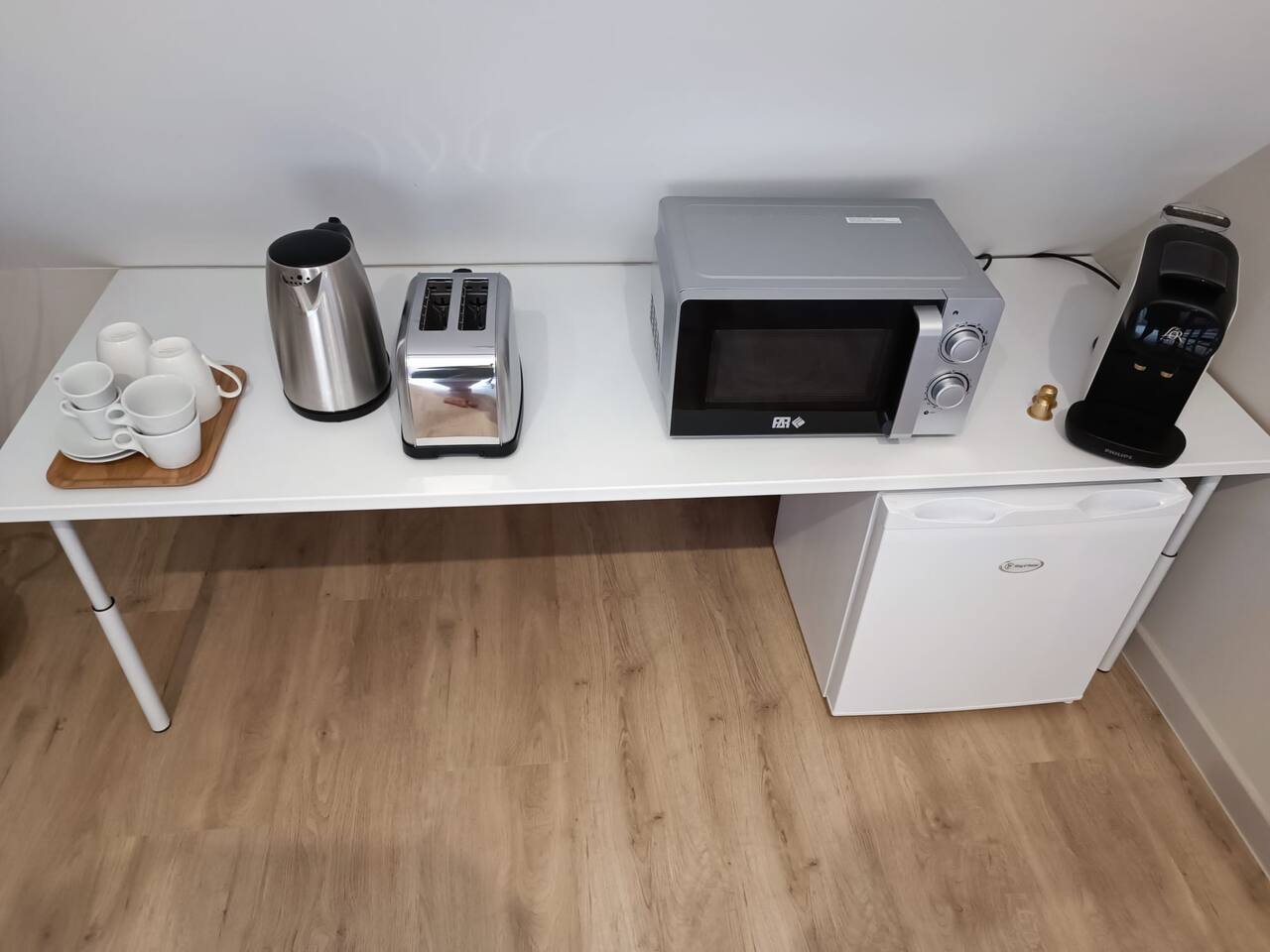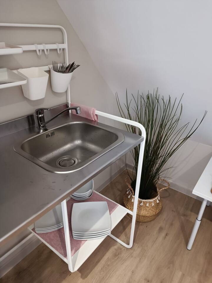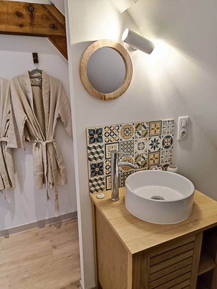 Un coin cuisine discret et fonctionnel, équipé d’un réfrigérateur et de tout le nécessaire pour savourer vos petites attentions gourmandes.