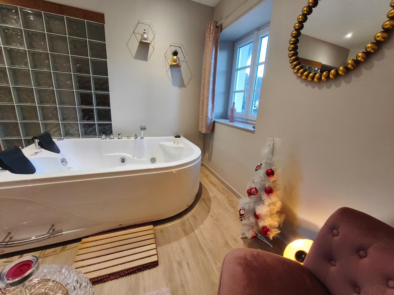 Une baignoire balnéo deux places avec jets massants, lumières d’ambiance LED et aromathérapie pour des moments de détente absolue à deux.